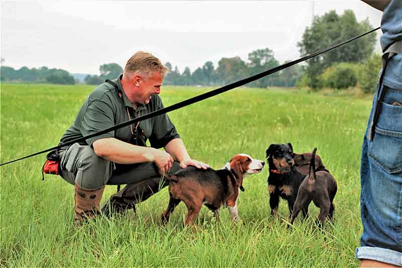 Cato (Deutsche Bracke) und Fred (Deutsch Kurzhaar), zwei nur wenige Wochen alte Welpen machten mit bei den Übungen zur Leinenführigkeit und Schleppenarbeit.